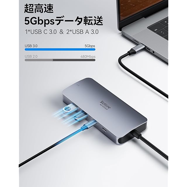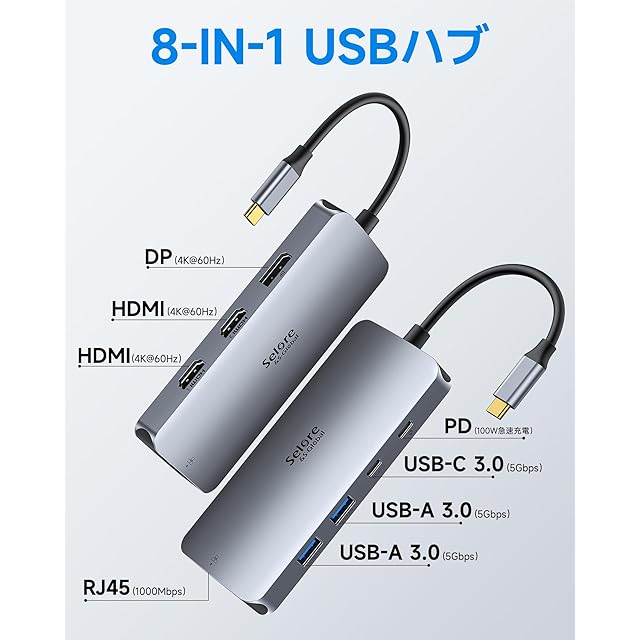 【マルチモニター 3画面拡張 2つHDMI+DP+LAN 】Selore 8in1ドッキングステーション hdmi 2つ 4K対応 3画面出力 モバイルタイプ 100W 急速充電 Displayport LAN 2 USB-A/USB-C 3.0ポート usb ハブ type-c MacBook Pro/Air 2020 Dell/Lenovo Yoga HPなどタイプC機種に対応