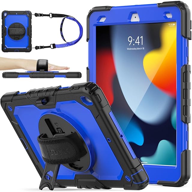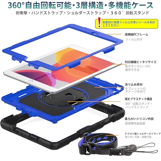 SEYMAC stock iPad 10.2インチ 第9世代/第8世代/第7世代 ケース 耐衝撃 保護フィルム付き ペン収納 360°回転スタンド ハンドストラップ ショルダーストラップ 全面保護カバー (ブルー+ブラック)