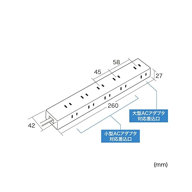 差込口は45mmピッチで小型ACアダプタが10個接続可能です。iPadなどのタブレットの充電器接続に便利です。1箇所はピッチが58mmと広く、大型のACアダプタが設置可能です。