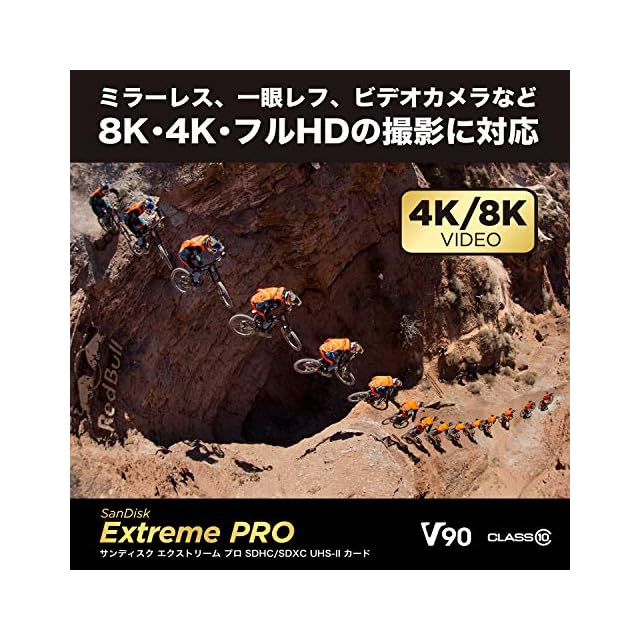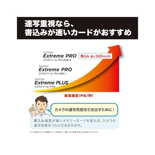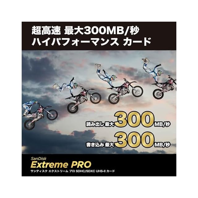 "プロレベルのパフォーマンスを活用:最大300MB/秒2の書き込み速度で、カメラのバッファを高速にクリアするので、思い出に残るショットも見逃しません。 2 最大読み出し速度300MB/秒、最大書き込み速度300MB/秒。90MB/秒の最低持続書き込み速度。社内テストに基づきます。パフォーマンスは、ホスト機器、使用状況、およびその他の要因により異なる場合があります。完全なパフォーマンスを実現するには、サンディスクUHS-IIレコーダーが必要です。1MB=1,000,000バイト。"