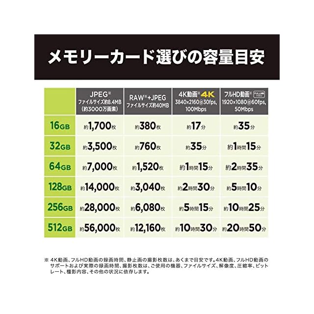 "中断なく長時間撮影:最大512GB1の大容量で、カードの交換やデータのオフロードをすることなく、60 fpsで撮影した4K UHDビデオ3を最大352分、30 fpsで撮影した8Kビデオ3を最大286分保存できます。5 3 4K UHD(3840x2160)および8K(7680x4320)ビデオのサポートについては、ご使用の機器、ファイルサイズ、解像度、圧縮率、ビットレート、撮影内容、その他の状況に依存します。 5 使用の目安:実際の数値は、ファイルのサイズ、解像度、圧縮、ビットレート、コンテンツ、ホスト機器、あらかじめ読み込まれているファイル数、その他の要素により異なります。"
