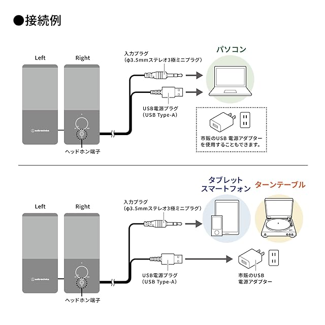 【コンセントのいらないUSB給電タイプ】PCやオーディオ機器などのUSBポートにUSB Type-Aプラグを、ヘッドホン端子 にφ3.5mmステレオミニプラグを接続すればセッティングが完了。音楽を聴きたいときに、PCやオーディオ機器にある2つの端子に接続するだけで簡単にすぐに使えます。また、有線接続なので音が遅れて聴こえるような心配もありません。