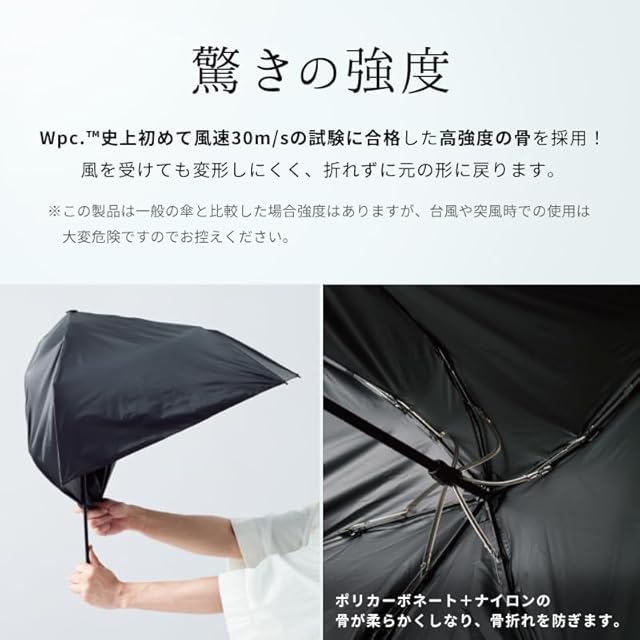 【驚きの強度】Wpc. 史上初めて耐風30m/sの耐風試験に合格した、高強度の骨を採用。 風を受けても変形しにくく、折れずに元の形に戻ります。 ※この傘は一般の傘と比較した場合強度はありますが、台風や突風時での使用は大変危険ですのでお控えください。