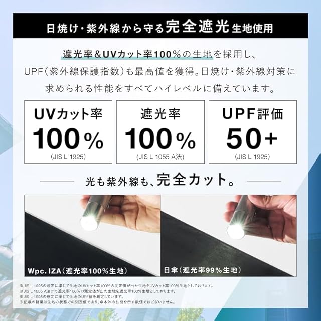 【遮光率・UVカット率100%、UPF50+】 全カラー遮光率・UVカット率ともに100%、UPF50+を実現し、日差しからお肌を守ります。 涼しく過ごすための遮熱性も優れているため、暑い夏の熱中症対策にも。