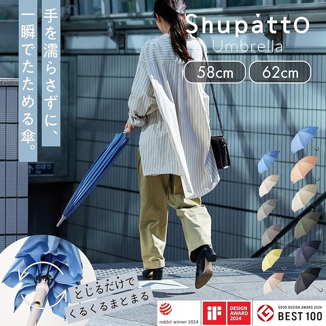 【中開きで固定】中開きの状態で固定して乾燥できるので、傘に残った水滴を乾かせます。細めで握りやすい58cm、しっかりとした握り心地の62cm。ファッションに合わせやすい優しい色合いのラインナップです。