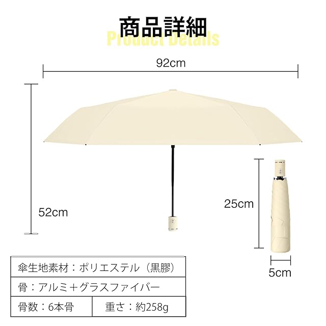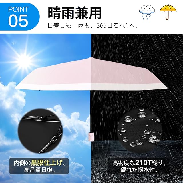 【最高ランク5級の撥水力】 撥水性に優れた高性能ポンジー生地を採用し、水滴が瞬時に転がり落ちます。軽く振るだけで水が切れるので、傘をたたんだ後も手やバッグが濡れにくく、雨の日も快適に使えます。