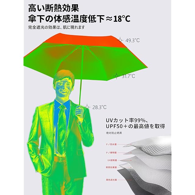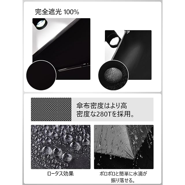 【UV カット 100% 完全遮光の涼感日傘】:30D 280T 超軽布にブラックラバーコートを施し、紫外線カット率 UPF50+(光透過率 0)!傘下温度は外界より 5~7℃低下し、真夏の強い日差しを完全に遮断。肌への紫外線ダメージを徹底的に防ぎ、心地よい日中生活をサポートします。