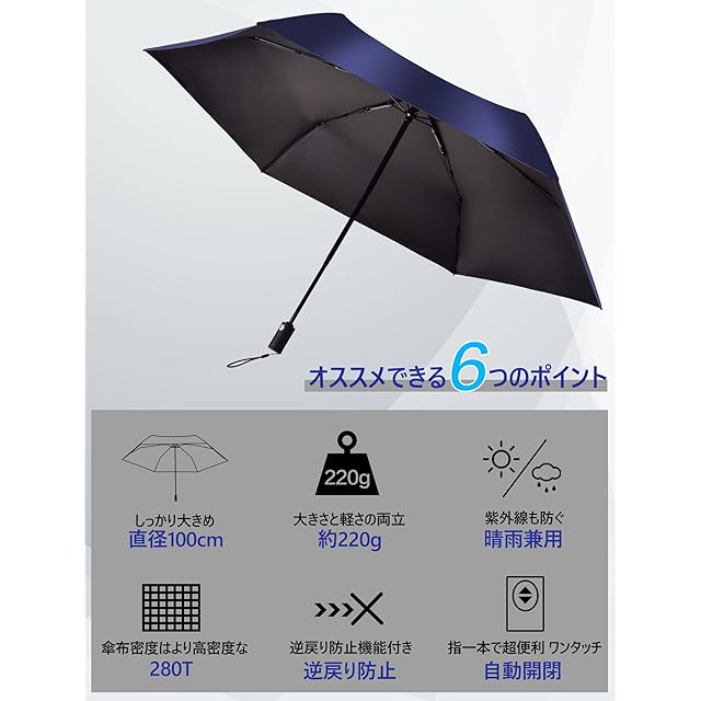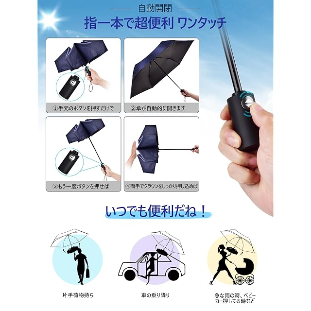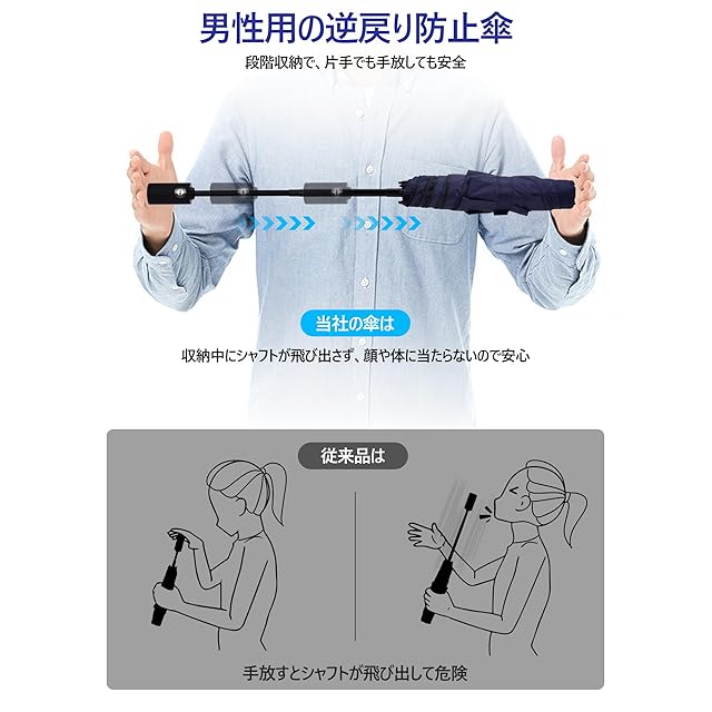 【逆戻り防止 ワンタッチ自動開閉】:98 カ所のカーブポイントで「節々収納」が可能!収傘時に途中で止めてもバネ返ししない安全設計。片手操作で瞬時に開閉でき、車の荷物を抱えたり、電車の混雑時でもスムーズに使用できます。