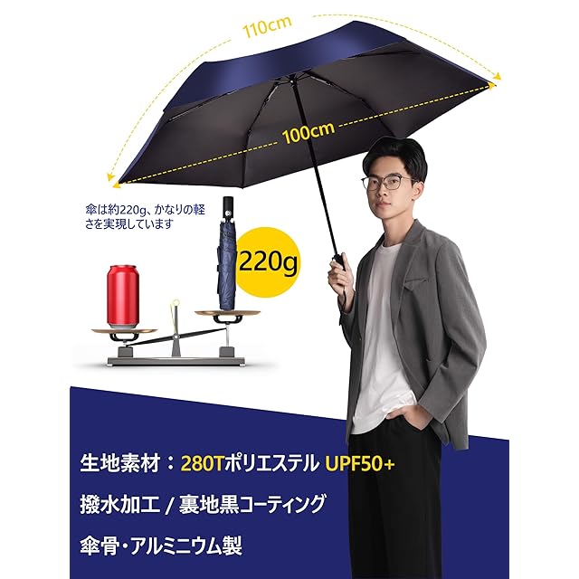 【超軽量 220g コンパクト折りたたみ日傘】:男性用のビジネスバッグやポケットにも簡単収納!全長 29cm、厚さ 4cm のコンパクトデザインで、片手で持ち運び可能。軽量でありながら航空アルミ合金製のフレームで丈夫で、通勤、出張、旅行など様々なシーンで活躍する晴雨兼用の折りたたみ傘です。