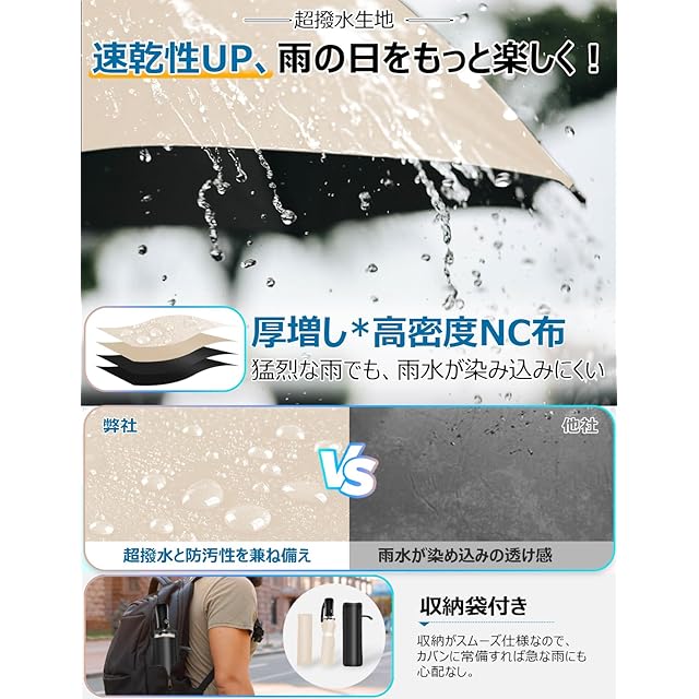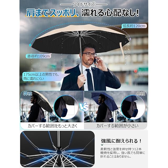12本超強靭な骨組みで「強化型傘」。☂【12本骨強化型&強風耐久性】様々な意見をまとめて、新作の晴雨兼用傘がようやく登場!男性の方が求める機能を全て取り入れた究極の強化型傘です。柔軟性と強度を併せ持つ12本親骨を採用し、普通の8傘本骨より、耐風性と耐久性ともに向上させた、防食加工が施された傘のフレームは超強靭で錆びにくい上に、強風にあおられても豪雨に打たれても折れたり曲がったりしにくいです。3段折り構造により、強風で裏返ってもちゃんと元に戻ります。安易に折れたり曲がったりする心配ありません。梅雨はもちろん、豪雨、強風にも安心できます。(※通常の傘より少し重いですが、機能を重んじて傘の強度と大きさを求めて作られています。重さに気になる方は何卒ご理解のほどよろしくお願い致します。)