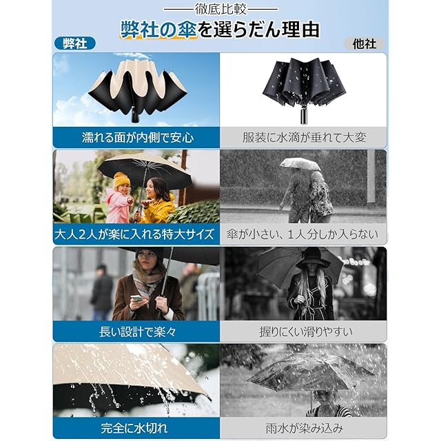 超人気濡れない「逆折り式傘」。☂【濡れない逆折り式傘&カバー付き】通常の傘は濡れた部分が外側になりますが、逆折り式傘は、閉じたときに濡れた部分が内側になるというユニークな傘。手が濡れない傘として大人気です。閉じる際に手が濡れにくく、人混みや電車の中でも、まわりが濡れないように気を遣う必要がないです。衣服・荷物・車のシートなどを濡らしたくないときにも便利です。さらに、高撥水生地を採用し、水をはじきやすく、軽く振るだけで雨水を落とすことができます。カバーや袋付きなので、使用後すぐにカバンに収納できます。ホコリや汚れから傘をガードできるほか、使ったばかりの傘をしまっても服やバッグを濡らしません。より一層便利さが進化した折り畳み傘です。電車やバスなど公共交通機関を利用する方におすすめです。