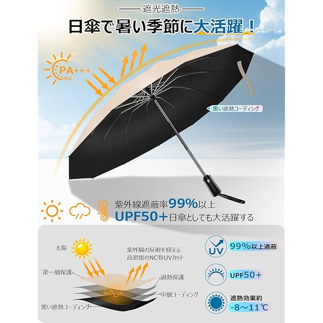 日傘としても使える「晴雨兼用傘」。☂【紫外線・暑さ対策&夏日通勤の重宝】厚めのナイロン生地に特殊コーディング加工を施し、紫外線を99%以上カットできる折り畳み傘です。内側を暗い色にすることで、地面の照り返しを吸収するので、上からも下からの紫外線も防ぐ効果があります。日焼けから守ってくれます。日差しが通さず遮光性パッチリで、眩しい感じも軽減します。ますます暑くなる夏日に、落ち着いたイメージで男性が日傘として使っても違和感がなく、熱中症予防にも役立ちます。雨の日だけでなく、暑い季節の通勤に日傘としても活用可能。晴雨兼用として一年中お使いいただける折り畳み傘です。