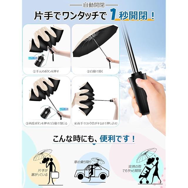 急な雨の際にあると便利な「折りたたみ傘」。☂【ワンタッチ自動開閉&片手で楽!】業界最新な技術を採用されていて、ボタンを押すだけで傘を開いたり閉じたりできます。片手でも簡単に開閉できます。傘を閉じる時に撥ねてくる雨粒で袖が濡れる気まずさにさようなら!突然雨が降り出したけど、傘を開くのに手間取り濡れてしまったという経験がある人も多いのではないでしょうか。ワンタッチ自動開閉式なので、スピーディに開けられます。雨の日の車の乗り降り、子供を抱きかかえている時や荷物の多いときも楽です。外回りの仕事、突然の夕立にもサッと広げる事が出来て、いつでも安心しています。(ご注意:密封することにより少し折りたたみ傘特有のニオイがありますが、健康に影響はございませんので、安心してご使用ください。ニオイが気になる場合は風通しの良い場所に1、2日置いておくとニオイも気にならなくなります。)