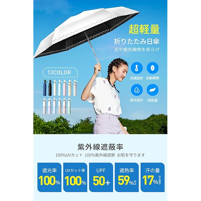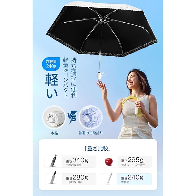 【超軽量・持ち運び日傘】軽くて丈夫なグラスファイバー親骨とアルミ合金中棒を採用し、通常より軽量化され、重さ240g、折り畳んだらわずか4cmとスリムサイズ、バッグにかさばらずにすっぽり入り、携帯に便利な折り畳み日傘です。通学通勤など毎日持ち歩いても負担にならない、夏フェス、スポーツ観戦、野外イベント、ライブ、キャンプ、登山、遠足、旅行、アウトドア活動など、屋外でも快適に過ごせる暑さ対策グッズとして大変重宝されます。