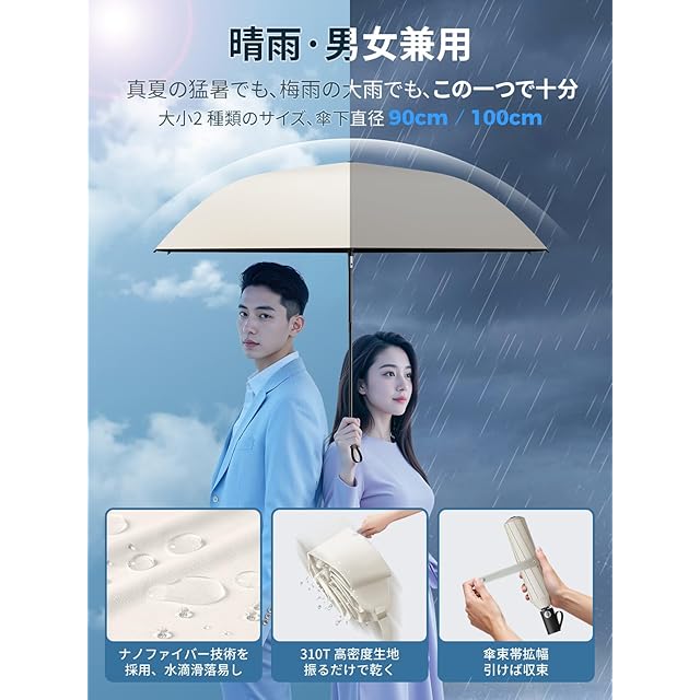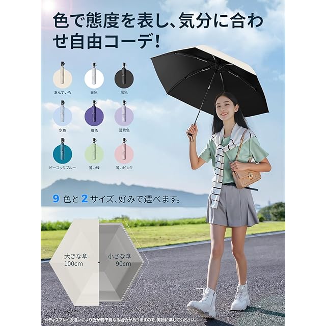 【大小2 種類のサイズ、傘下直径 90cm/100cm・9 色から選べます】90cm の小サイズは軽量で持ち運びが簡単で、いつでもどこでも風や雨を遮ってくれます。日常の通勤や買い物の際に、最適なお供となります。100cm の大サイズは、適切な遮蔽面積で、全方位の保護を提供します。突然の激しい雨でも、心配することはありません 。人それぞれユニークな個性とスタイルを持っています。UPEB が丹念にデザインした 9 色は、服との相性が良いだけでなく、それぞれ鮮明で特徴的です。傘を差して歩くすべての瞬間に、あなたが独一無二の風景になれます 。