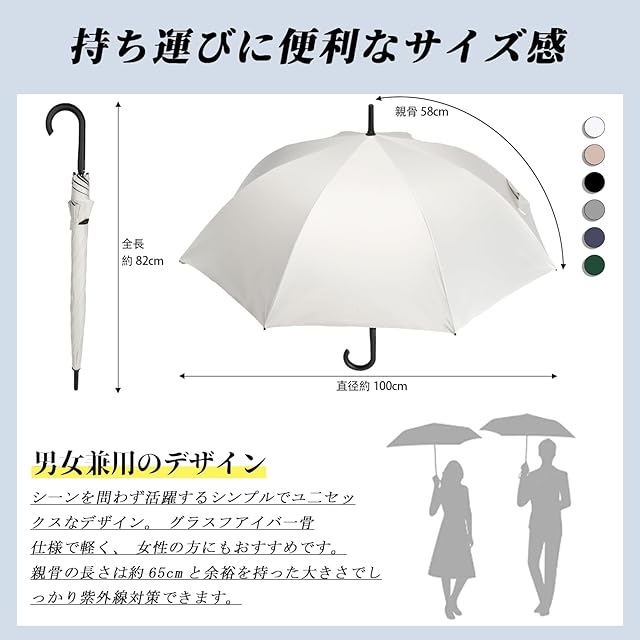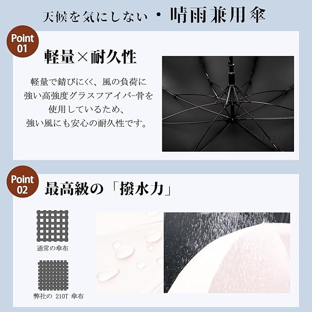 【晴雨兼用日傘*耐风防水】この製品は、紫外線遮蔽・遮光・遮熱効果を目的とした日傘です。高密度の撥水加工材料で作られ、雨が珠のように丸くなり転がり落ちます。また、傘は親骨と中棒が高品質のグラスファイバーで作られ、傘の強度を向上させ、激しい雨でも安心して使用できます。一年中季節問わず使うことができ、梅雨対策にもUV対策にも欠かせない優秀なアイテム!