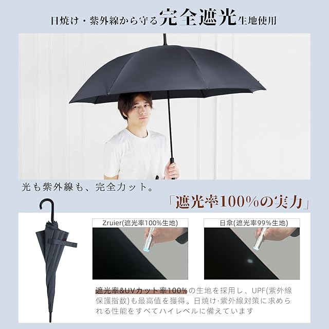 【高いUV機能·完全遮光日傘】 Zruierの生地は全カラー遮光率・UVカット率100%・UPF50+を取得。 日焼けを防ぐために必要なUVカットの性能を兼ね揃えた、紫外線対策にはピッタリのアイテムとなっています。しかも、生地が破れたり破損したりしない限りは遮光率は落ちません!