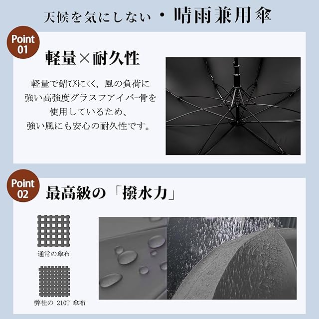 【晴雨兼用日傘*耐风防水】この製品は、紫外線遮蔽・遮光・遮熱効果を目的とした日傘です。高密度の撥水加工材料で作られ、雨が珠のように丸くなり転がり落ちます。また、傘は親骨と中棒が高品質のグラスファイバーで作られ、傘の強度を向上させ、激しい雨でも安心して使用できます。一年中季節問わず使うことができ、梅雨対策にもUV対策にも欠かせない優秀なアイテム!