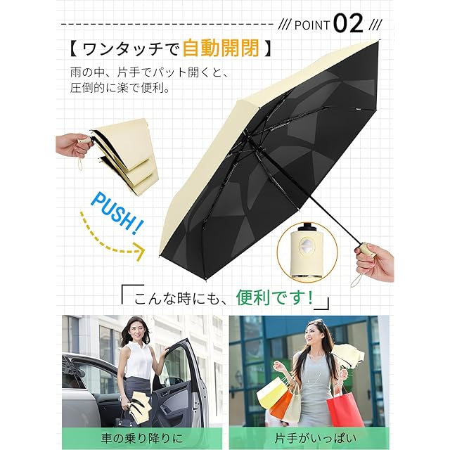 【自動開閉・片手で楽】たった3秒で折りたたみ可能で、ボタン一つで自動開閉もできます。傘を開くときは留め具のボタンを外したら傘を上へ向けてボタンを押すだけ、スムーズに素早く柄が伸びて傘がしっかり開きます。片手で傘先の金具に固定する必要がないので、荷物が多い時、降雨時に車から降りる時にもパッと開く、濡れる心配がなく、圧倒的に楽で便利です。