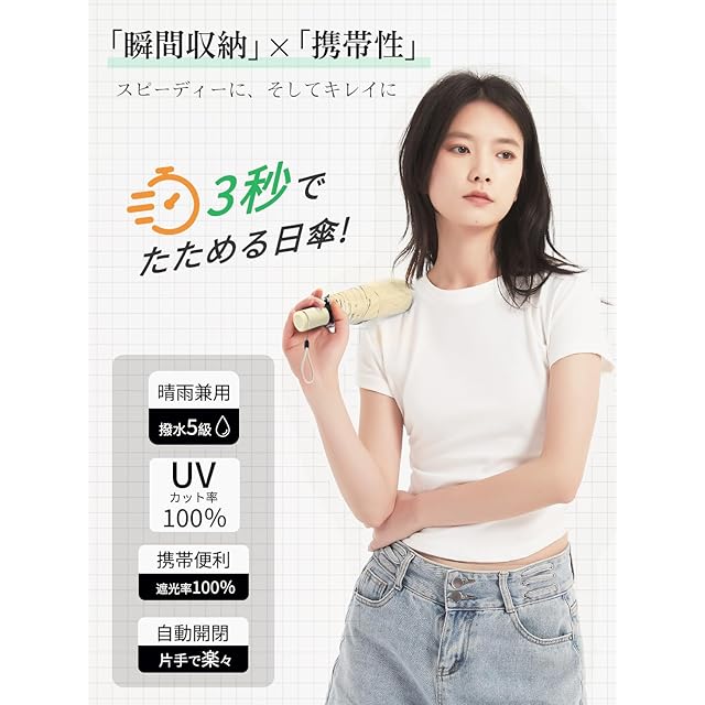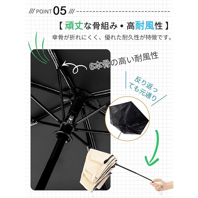 【晴雨兼用・5級撥水加工】外層の傘布は防水性、疎水性、不透過性を備えナノコーティングを採用し、5級までの超撥水力を実現しました。驚くほど、雨粒を引いてくれます。最高クラスの撥水度5級をクリアしているため晴れた日の日差し対策としてはもちろん、急な雨にも対応できる撥水のテフロン加工も施されているので晴雨兼用で使用できます。