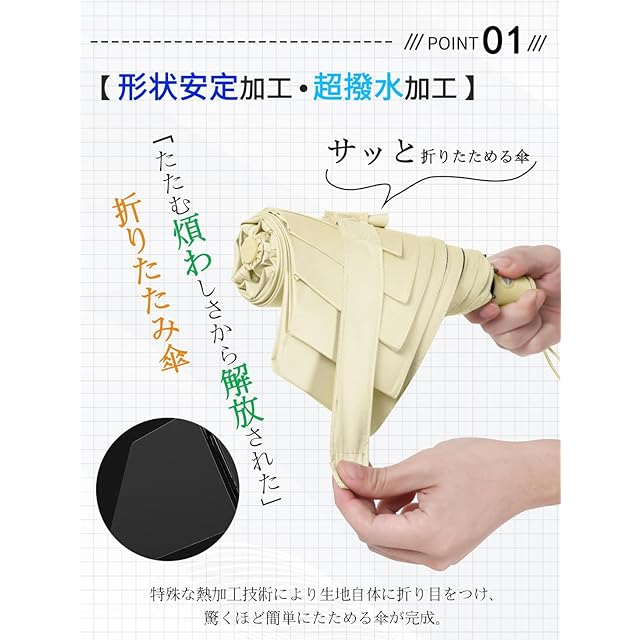 【2025進化系・形状記憶加工・3秒ととのえる!】おりたたみ傘の畳みにくい難点を解消するために開発した「形状記憶加工」シリーズがついに登場しました!傘布を形状記憶加工することで、日傘を閉じた時折り目に沿ってピシッと揃えることが可能になりました。このまま留め具を閉めれば、あっという間にキレイに収納できちゃいます。非常に簡単に傘布を揃えて閉じることができるので、これまで苦手意識のあった方も使う煩わしさが軽減され、折り畳み傘をグシャグシャにたたみたくない方には特におすすめです。