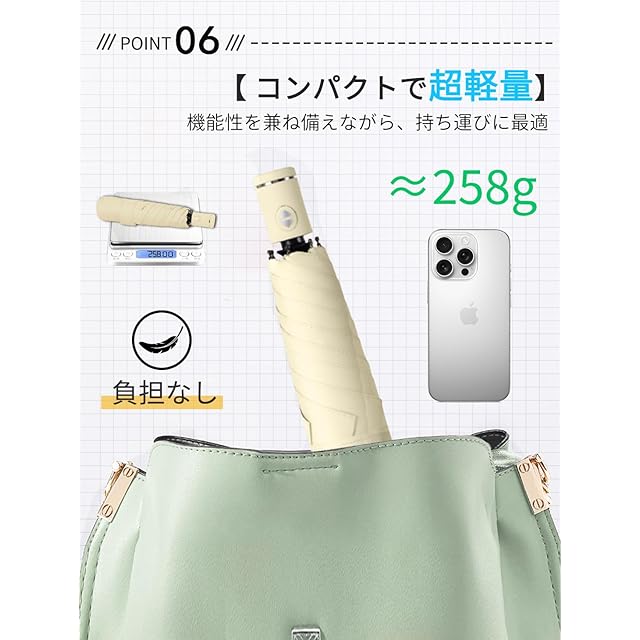 【軽量・コンパクト・携帯便利】折りたたみ日傘はアルミニウム合金とグラスファイバーの骨組みを採用し、屈曲性に富んで、軽量性・携帯性・頑丈さを一気に実現します。開いた状態で直径92cm、収納時は厚さがわずか25×5cmと超薄型で、ポケットにも収まるコンパクトなデザインです。重さは約258gと非常に軽量で、日常的な持ち運びに最適で、邪魔になりません。通勤や通学、旅行、ハイキング、スポーツなど、多様なシーンで利用でき、幅広い世代の方々にご愛用いただいています!