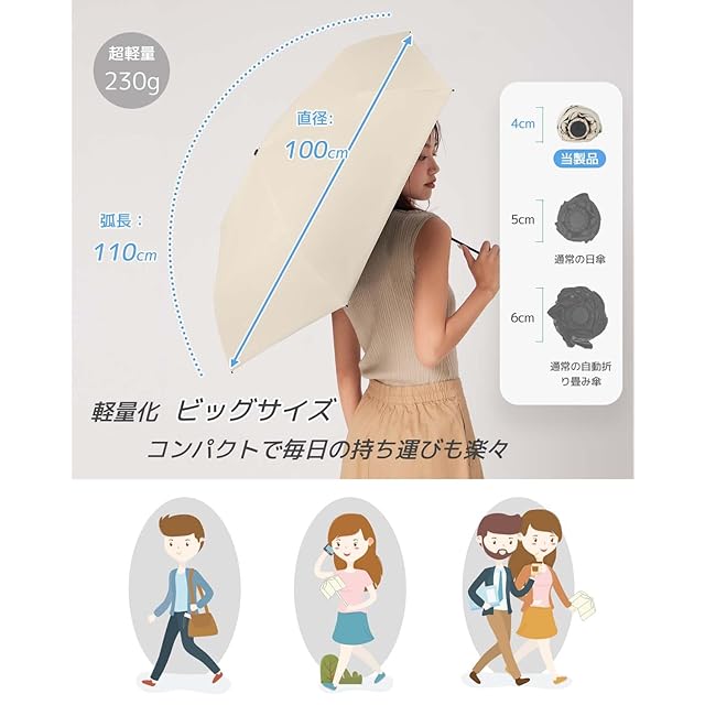 【コンパクト、超軽量、ビッグサイズ、頑丈】konciwaの折りたたみ傘は、最先端の軽量で丈夫なグラスファイバーとアルミ合金の骨組みを採用し、軽量性、コンパクトさ、頑丈さを実現! 開いた状態の直径は100cm、収納時の厚さは僅か3.5cm、超薄型でポケットに収納できる超コンパクト設計! さらに、約230gの重さは非常に軽く、毎日の持ち運びに最適! 通勤・通学、旅行、ハイキング、スポーツなど、あらゆるシーンで幅広く利用でき、老若男女問わず幅広い世代の方々にご利用いただけます!