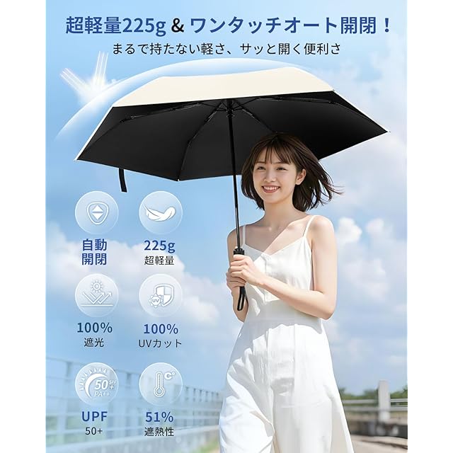 【紫外線対策の決定版!】JIS規格に適合した高密度遮光素材(UVカット品)を使用した折りたたみ傘です、99%以上のUVカットで真夏の日差しも安心、波長380nmまでの広範囲紫外線を徹底遮断(※検査機関実測値)、日傘なのに「涼感設計」!体感温度-3℃の遮熱効果で灼熱対策。