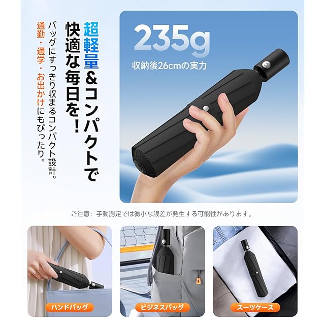 【365日持ち歩きたくなる極上コンパクト日傘】SILVLFのおりたたみ傘は、最先端テクノロジーを結集した235gの超軽量ボディ!航空宇宙技術にも使われる高強度ガラスファイバーと航空機用アルミ合金のハイブリッドフレームを採用し、驚異的な軽さと強度を両立。収納時わずか3.5cmの超スリム設計は、ビジネススーツの内ポケットにもすっぽり収まるほど。通勤・通学はもちろん、旅行やスポーツ、ショッピングなど、あらゆるシーンで「持ってて良かった」と思える使い心地です。