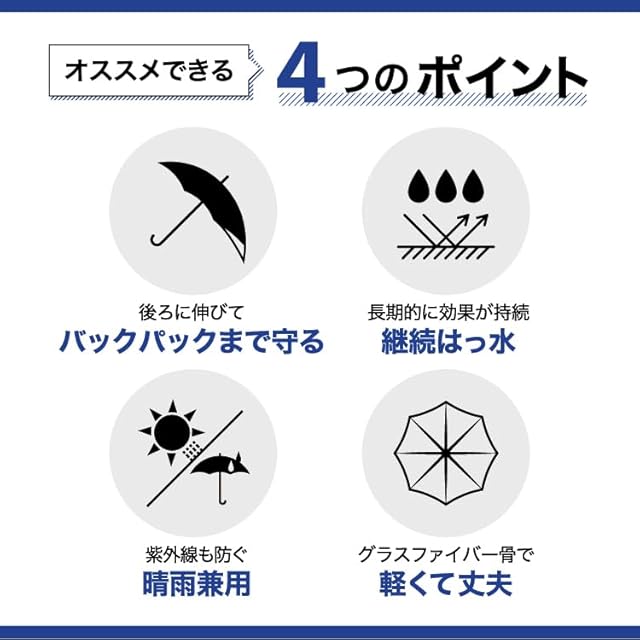 【継続はっ水】 長期的に持続するはっ水加工を施しているため、一般の傘と比べ、はっ水が持続します。