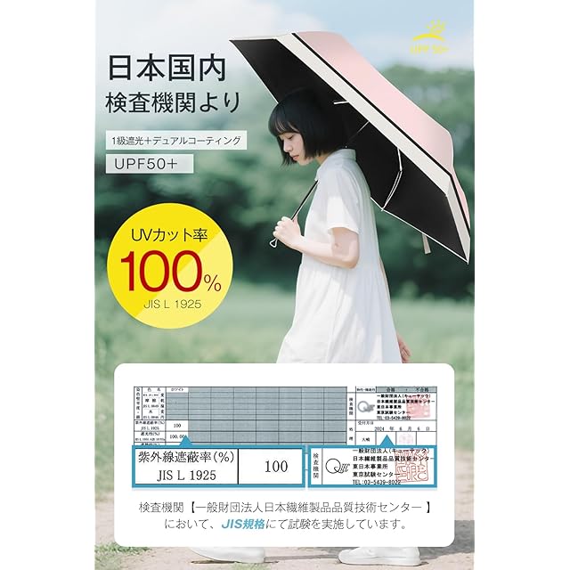 ☂【UVカット率100% 完全遮光日傘】遮光フィルムを生地にボンディングした多層生地設計を採用した日傘で、表側が強い日差しや紫外線を反射し、裏側が黒コーティングで光をまったく通さず、地面からの照り返しを顔に当たらないように吸収します。太陽光をシャットアウトする同時に、高熱性の赤外線もカットして遮熱効果抜群。JIS認証済みの遮光率、UVカット率ともに100%に達するUPF50+折りたたみ日傘です。真夏の日焼け防止アイテムとして使用すると、暑さもやわらげて、炎天下でもより快適に過ごすことができます。
