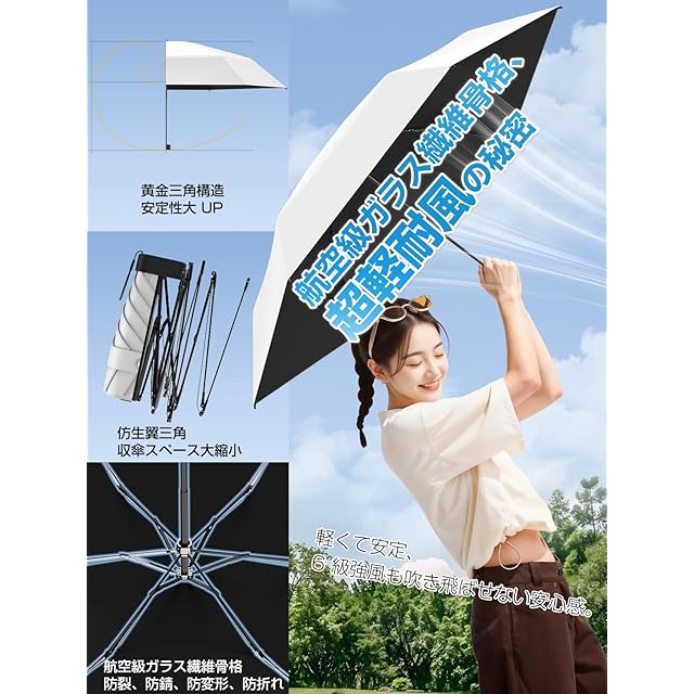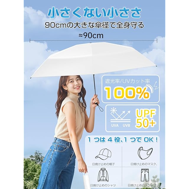 【100% 紫外線防止 & 100% 遮光・遮熱日傘】 特殊なコーティング技術と素材を使用し、100% の紫外線遮断性能を実現しています。有害な紫外線を完全に遮り、肌を日焼けや老化から守り、健康な肌を維持するために役立ちます。100% の遮光・遮熱機能も備えています。日差しの強い日にも傘を開けるだけで涼しさを感じられ、太陽の光と熱を効果的に遮断して、快適な空間を作り出します。