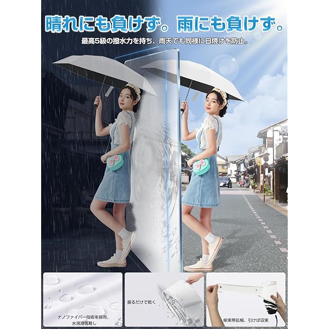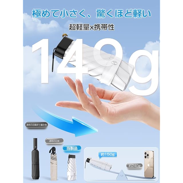 【149g 究極の軽量性 & 携帯性抜群】この軽量おりたたみ傘は、 軽量化技術を凝縮し、素材選択から構造設計まで細部にこだわり、極限まで軽く作られています。たった 149g の重量で、持ち上げるとほとんど存在感を感じないほどで、日常外出や旅行にも持ち運びが全く負担になりません。折り畳み式のデザインで、非常にコンパクトに収まります。小さなバッグやポケットにも簡単に入れられ、出先でも邪魔になりません。サイズは小さいけれど、機能は損なわれず、必要な時には素早く展開して使用できます。