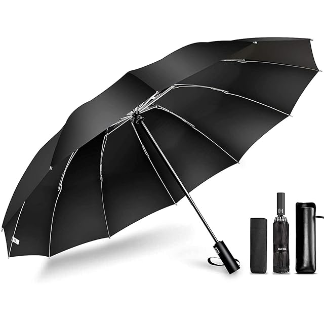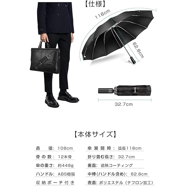 【濡れにくい大判折りたたみ傘】開いた状態で直径約108cm、曲面約118cmもある大きさで、通常の紳士傘に比べて、傘を差しながら荷物を持っていてもリュックを背負っていてもしっかりカバーしてくれて、ほとんど濡れません。体の大きな男性も窮屈さを感じることなく快適に使えます。折りたたむと長さ約32cmとなり、急な雨に備えてカバンなどに簡単に収納できます。