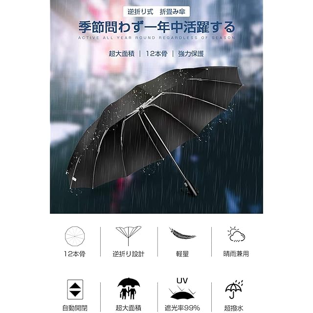 【超大サイズ・12本骨】 折りたたみ傘 ワンタッチ自動開閉 メンズ傘 大きい 逆折り式 折り畳み傘 風に強い テフロン加工 耐風撥水 丈夫耐久 折りたたみ日傘 遮光遮熱 UVカット 晴雨兼用傘 梅雨対策 台風対応 豪雨対応 メンズ レディース 母の日 父の日 ギフト (ブラック)