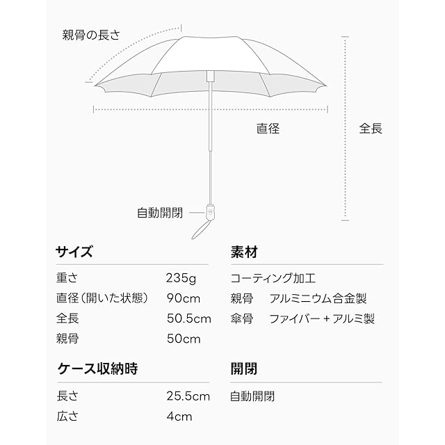 【ワンタッチ日傘 刺繍/無地】 折りたたむ時の長さは25.5cm、折り畳んだ厚さはわずか4cm、直径90cmの大きさで完全遮光なのに重さはたった235g!突然の雨や眩しい日射しに大活躍してくれます。スマホぐらいの重さなので、毎日持ち歩いてもストレスフリー。カバンに入れて携帯できるスリムサイズで急な雨でも安心です。