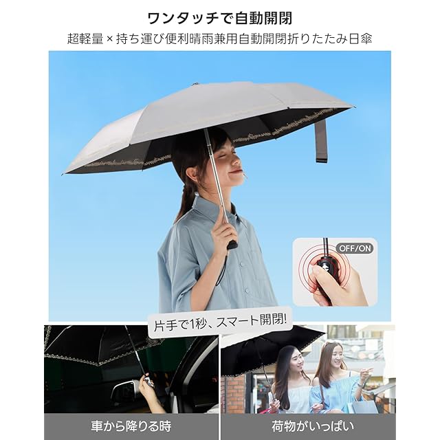 【自動開閉式折りたたみ傘】ワンタッチで自動開閉ができる日傘は、片手でも使え、とっさに傘を出して開ける際にはストレスがありません。車の乗り降りの際や、片手しかあいて無い時には大変便利です。普通な通勤用カバンや車に常備しておけば、緊急天候にも対応できます。