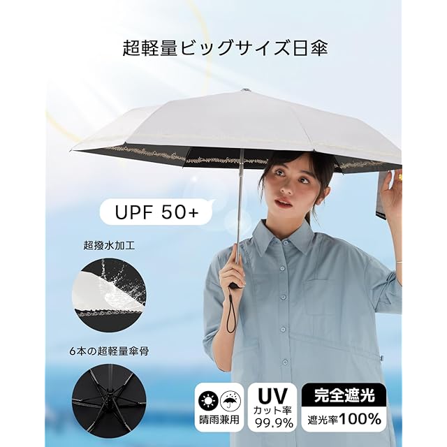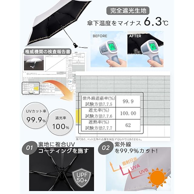 【UVカット・日焼け止め】日傘布の裏側はナノ抗紫外線ノリコーティングと断熱黒ノリコーティングを採用して、可視光と紫外線を遮断して、効果的に日焼け止めすることができます。暑い夏に、紫外線からしっかり肌を守れます。UPF50+、UVカット率99.9%以上、100%完全遮光で熱線となる太陽光線がカットされ、紫外線をブロックして、お肌を守り、熱い日差しの中でも涼しく過ごせます。