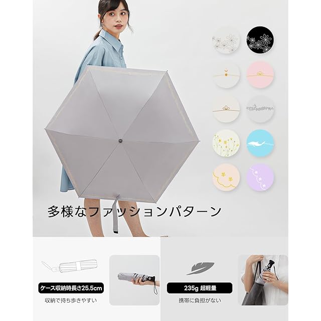 【ベーシックなデザイン】ドットやボーダーなや草花など、ベーシックなデザインにストーリーを持たせ、使い勝手とデザインにこだわった日傘です。シンプルだけど愛嬌のあるデザインとコンパクトなサイズで、ギフトやプレゼントにもおすすめです。