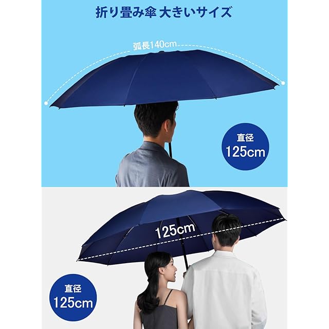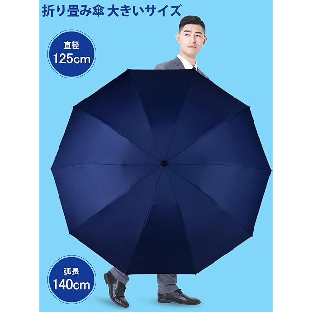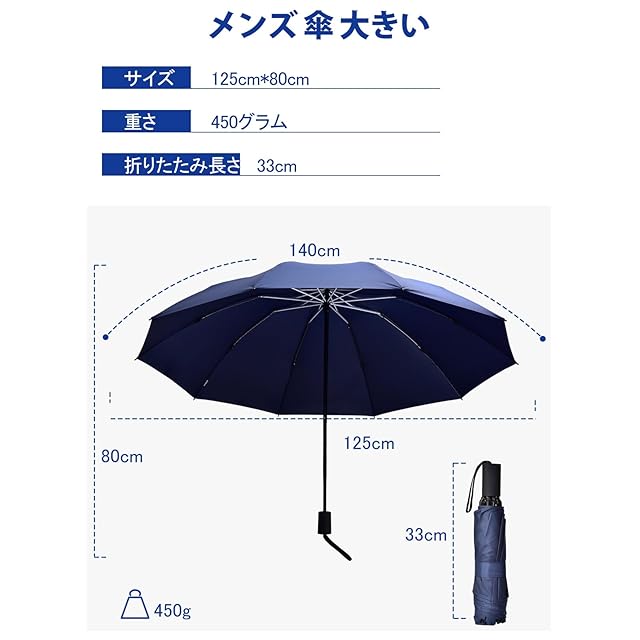 「大人2人が余裕で入る」:この弧長140cm、直径125cm「折り畳み傘 メンズ 大きいサイズ」は、大型化が特徴の折りたたみ傘です。体の大きな男性でも窮屈さを感じずに快適に使用できます。スーツや荷物もしっかりカバーできる「大きい傘」です。また、折りたたむと全長約31cmのコンパクトさとなり、通勤用カバンに収納可能です。「折り畳み傘大きい」でありながら、その軽量さも特徴としています。