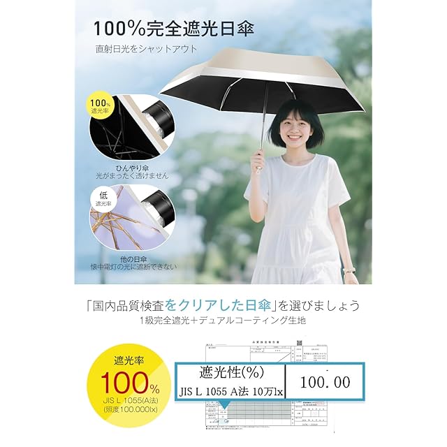 ☂【UVカット率100% 完全遮光日傘】遮光フィルムを生地にボンディングした多層生地設計を採用した日傘で、表側が強い日差しや紫外線を反射し、裏側が黒コーティングで光をまったく通さず、地面からの照り返しを顔に当たらないように吸収します。太陽光をシャットアウトする同時に、高熱性の赤外線もカットして遮熱効果抜群。JIS認証済みの遮光率、UVカット率ともに100%に達するUPF50+折りたたみ日傘です。真夏の日焼け防止アイテムとして使用すると、暑さもやわらげて、炎天下でもより快適に過ごすことができます。