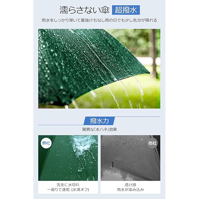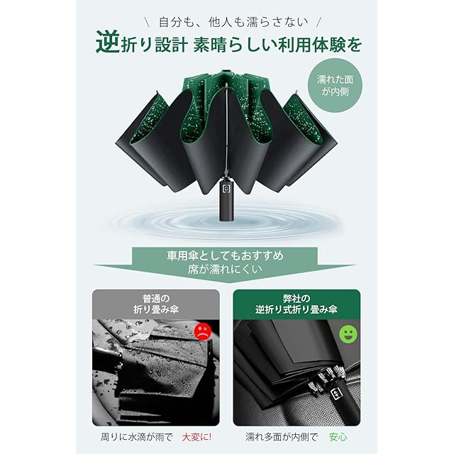 【超撥水性の逆折り式折畳み傘】高密度傘面に防水性の高いテフロン加工を施され、撥水性に優れていて、雨が傘に落ちたら水玉になりコロコロと滑り落ちていき、傘を閉じた後、数回振るだけで水滴を振り落とせます。そして、傘を畳むと濡れた面が内側にしまうので、雨水が服やカバンを濡らすことが少ない、車やタクシーに乗っても水滴が席につく心配はなく、電車、バスや人混みの中でも周りに迷惑を掛けずに済んで便利です。