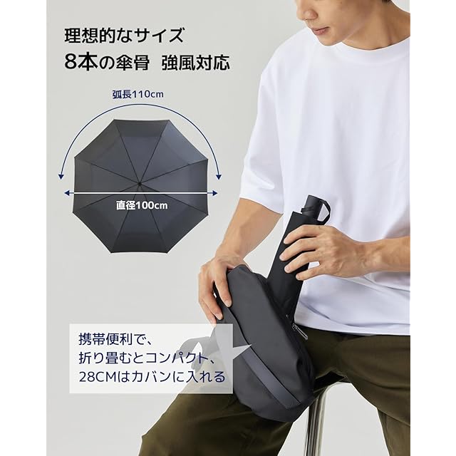 【軽量おりたたみ傘 ・ゆとりのある大きいサイズ】折り畳み傘 軽量 の重量は約260g、広げたとき傘の直径は約100cm、弧長は約110cmまで、体の大きな男性でも窮屈さを感じずに快適に使え、スーツや荷物もしっかりカバーされます。折りたたんむと全長約28cmのコンパクトさで、通勤用カバンに収納可能。また、収納ポーチ付き、カバンや車に常備すれば急な雨にも心配なし。