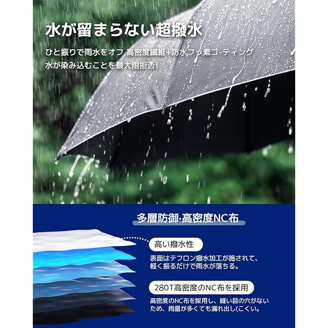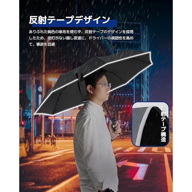 【強風や豪雨に負けない耐久性&高強度な傘骨】 頑丈な8本親骨で作られ、耐風性と耐久性ともに向上させたおりたたみ傘。なお、軽量ながら頑丈であるアルミと壊れにくいグラスファイバーでできているので、軽くて普通の傘より横強度が25%強く、豪雨、強風にも安心できます。万が一風にあおられておりたたみ傘が裏返ってしまったとしても、開閉ボタンを押したら、元通りになるから、壊れにくいです。