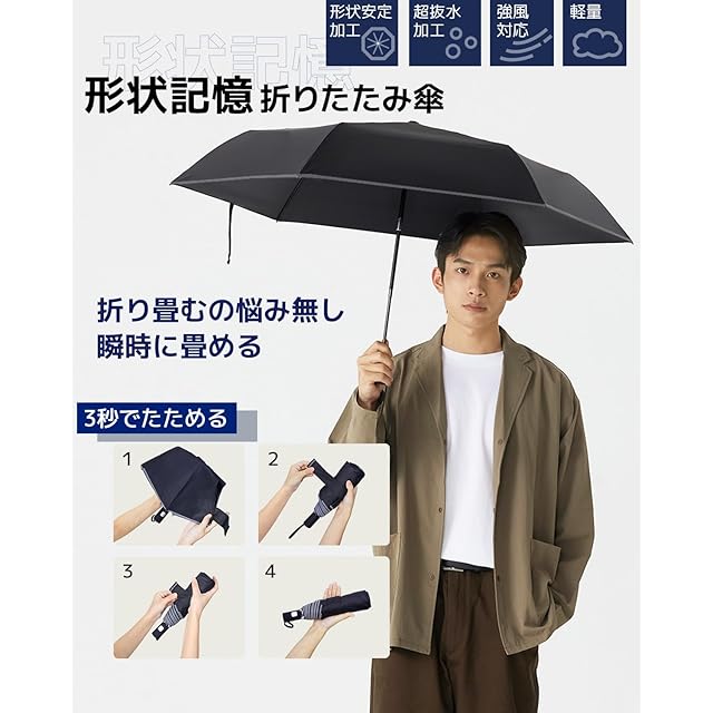 形状記憶 折りたたみ傘 3秒でたためる傘 軽量 260g 8本骨 自動開閉 konciwa ワンタッチ 自動開閉 メンズ 折り畳み傘 おりたたみ メンズ レディース 折りたたみ傘 ワンタッ 撥水速乾 耐強風 男女兼用 携帯しやすい (ブラック)