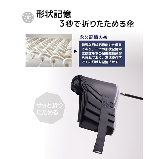 【形状記憶加工】折りたたみ傘の畳みにくい難点を解消するために開発した「MFU」シリーズがついに登場しました!形状記憶加工により、3秒でたためる傘.また、収納時にはかさばらず、綺麗にまとめることができます。一般的な形状安定傘は、傘地にシートを貼り付けて作るため、重さが気になったり、使用している中で剥がれてきたり、骨に負担がかかったりする問題点があります。一方、KONCIWAの傘は形状が安定しています。生地には数千本の形状記憶糸が織り込まれ、高温加工が施されています。これにより、軽量でありながら、形状記憶効果も永久的に維持されます 。たたむ動作が簡単になるので、これまで苦手意識のあった方も使う煩わしさが軽減されます.