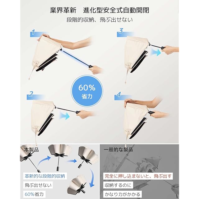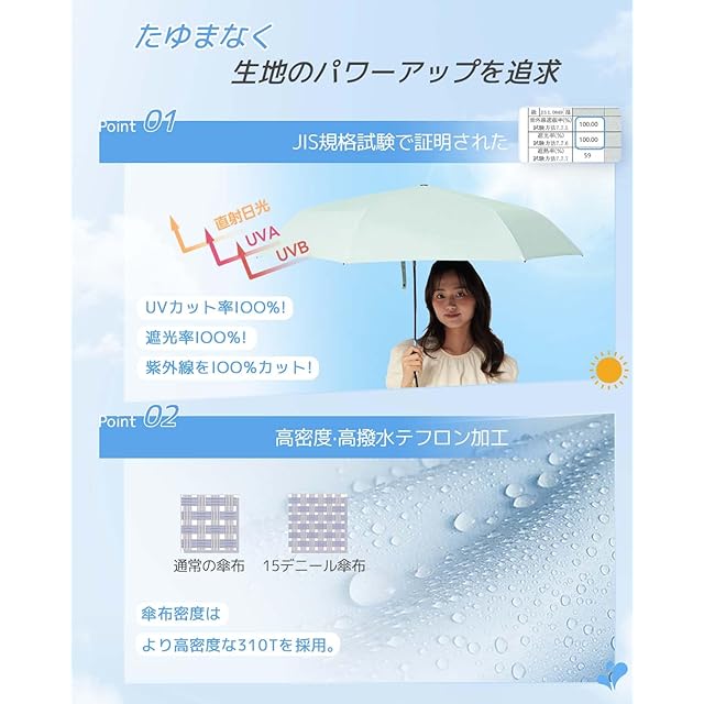 【晴雨兼用&超撥水性】優れた抗水性を備えた310T防水ファブリック生地を採用し、特別な加工により、出色の撥水性能を実現しました。使用後に軽く振るだけで傘が乾きます。また、内側は多層コーティング処理が施されており、紫外線を効果的にカットしますので、日よけとしてもご利用いただけます。
