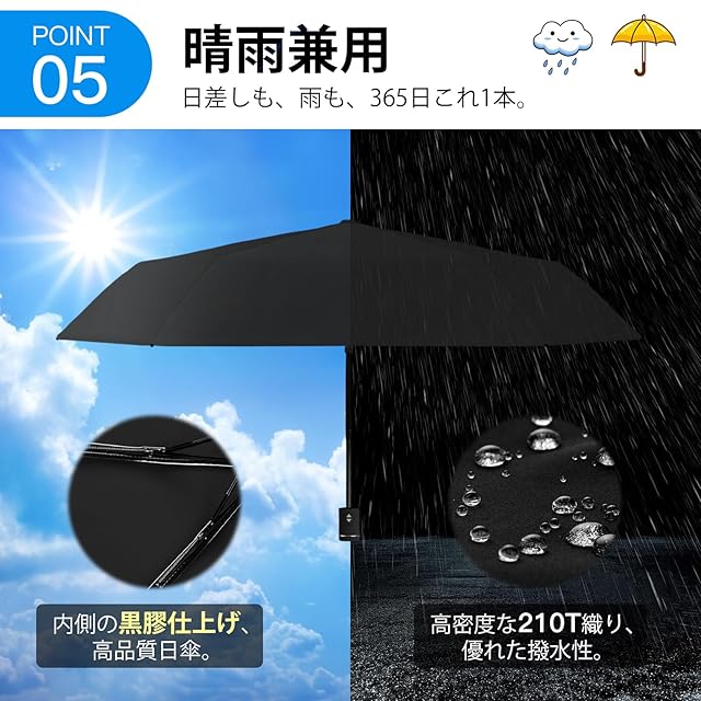 【最高ランク5級の撥水力】 撥水性に優れた高性能ポンジー生地を採用し、水滴が瞬時に転がり落ちます。軽く振るだけで水が切れるので、傘をたたんだ後も手やバッグが濡れにくく、雨の日も快適に使えます。