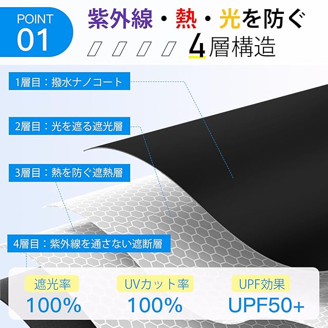 【JIS認証 UVカット率100% & 完全遮光】夏の肌と快適さを守る!遮光率が100%に至り、強力な遮光性で太陽光をしっかりカットし、紫外線を徹底ブロックし、敏感な肌をしっかり保護。特殊コーティング生地が熱を抑え、心地よい涼しさを提供、まるで清涼な木陰にいるような快適さを実現!