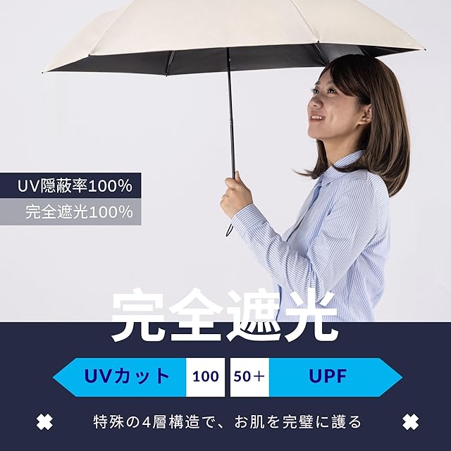 【完全遮光・UVカット率100%】太陽光を徹底的にブロック!この日傘は遮光率100%、UVカット率100%、そしてUPF50+の高い保護性能を誇ります。特殊なラミネート加工を施した内側の生地が、強力な日差しを完全に遮断し、お肌を万全に守ります。どんなに強い日差しの下でも、安心してお出かけください。